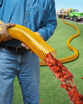 Flex-Tube® PU Outdoor Transfer Hose is a co-extruded all plastic hose that features urethane construction with a smooth interior and a drag-resistant spiral ABS helix wear strip. Easier for workers to handle in long lengths than conventional hose, it is 80% lighter (4” hose is 0.75 lbs./ft.) and 33% more flexible (6” CL bend radius), making it ideal for blowing bark mulch.